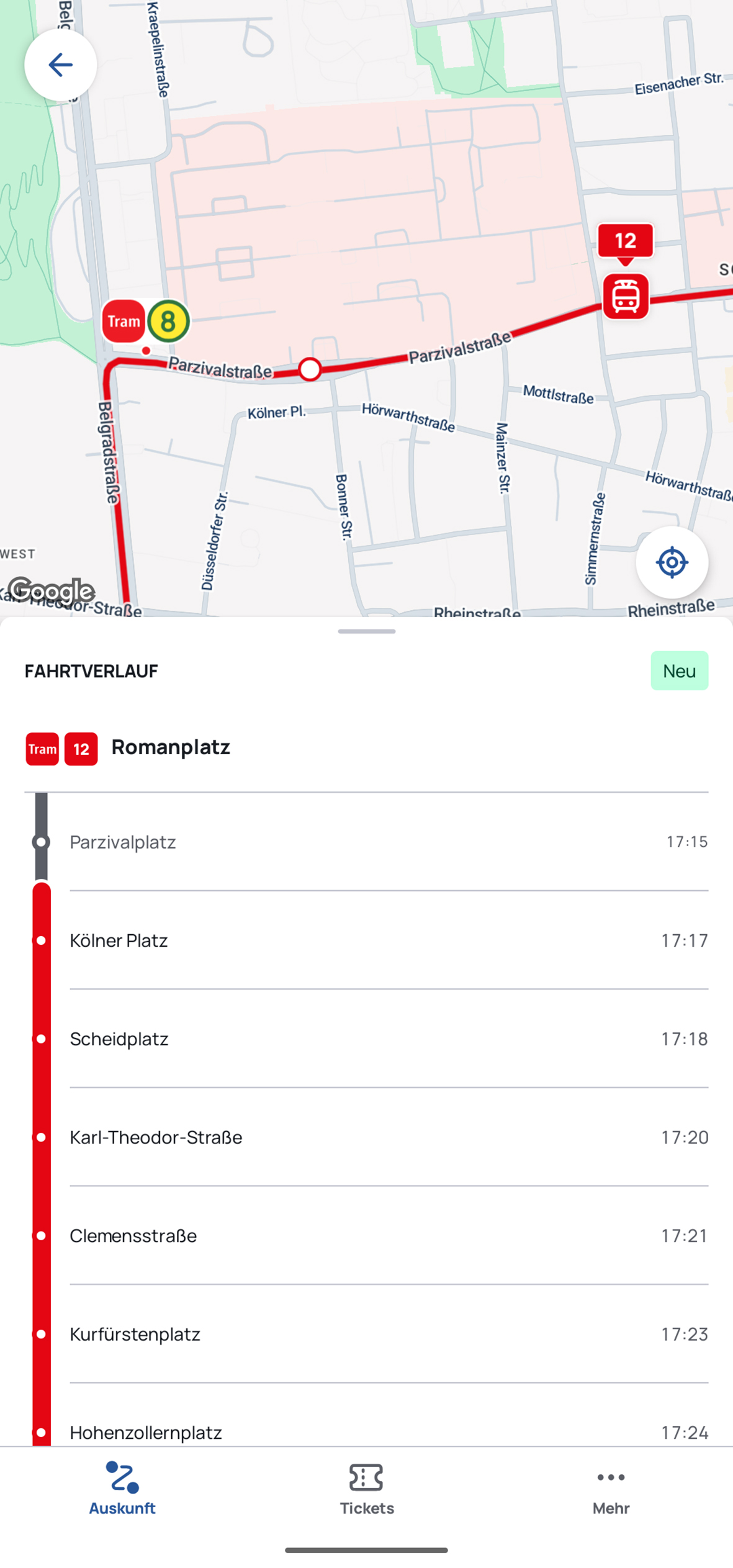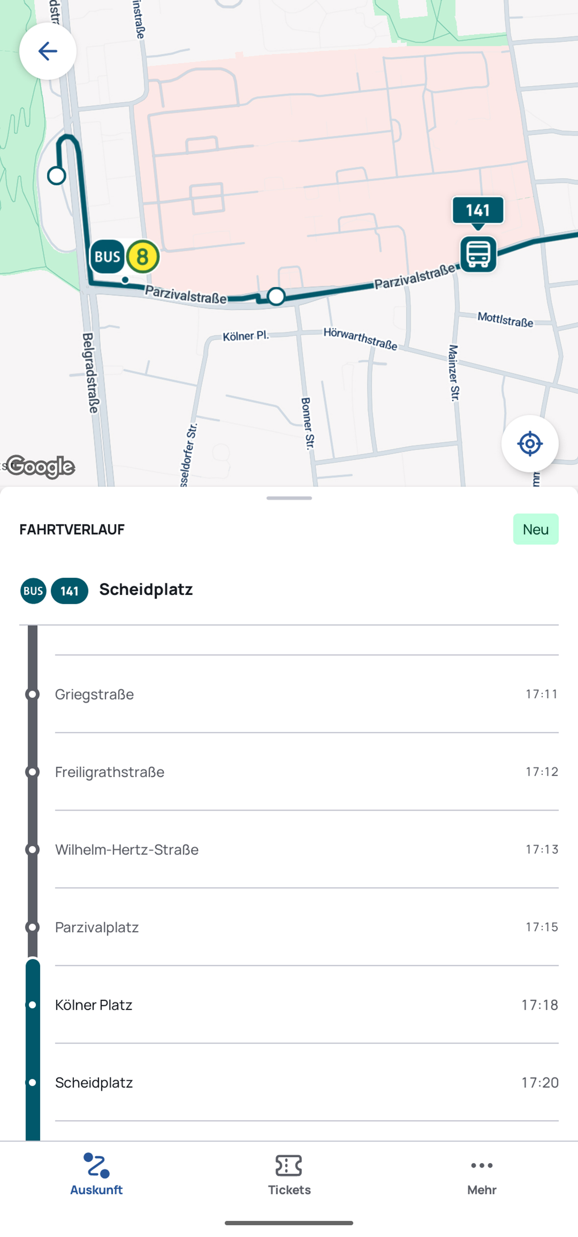 Bei der Auswahl einer entsprechenden Abfahrt öffnet sich die Kartenansicht mit der Live-Position des Fahrzeugs. Im unteren Bereich des Bildschirms erscheint das Linienband mit den bereits zurückgelegten sowie den noch anstehenden Haltestellen.