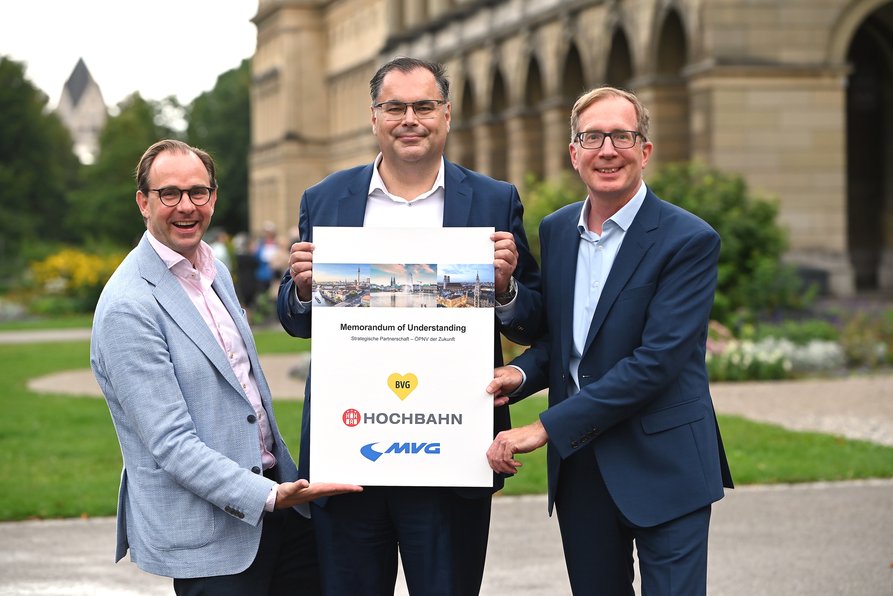 Die drei größten Nahverkehrsunternehmen Deutschlands wollen zentrale Zukunftsaufgaben gemeinsam angehen. Mit einem Schulterschluss arbeiten sie künftig Hand in Hand an smarten Mobilitätslösungen für Millionen Menschen in den drei Metropolen Berlin, Hamburg und München. Die Chefs der Berliner Verkehrsbetriebe (BVG), der Hamburger Hochbahn AG (HOCHBAHN) und der Münchner Verkehrsgesellschaft (MVG) haben dazu ein Memorandum of Understanding (MoU) für eine strategische Partnerschaft unterzeichnet. Damit entsteht erstmals eine überregionale Allianz der führenden Branchenvertreter mit dem Ziel, den ÖPNV der Zukunft gemeinsam und kundennäher zu gestalten, Synergien zu nutzen, um Kosten zu senken und Effizienzpotentiale zu realisieren, und branchenweit Standards zu setzen.