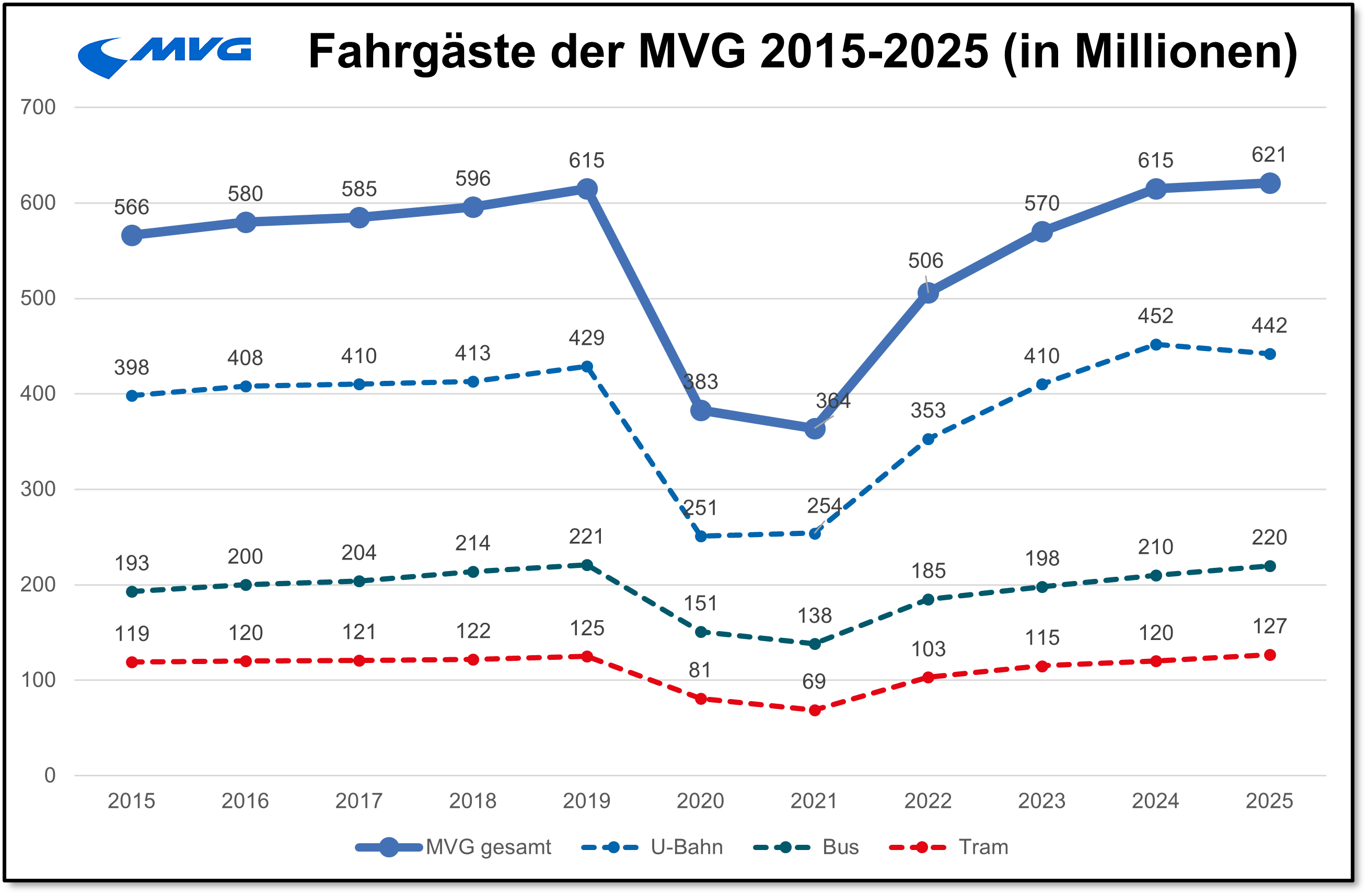 Die Münchner Verkehrsgesellschaft (MVG) hat im Jahr 2025 mehr Personen befördert als jemals zuvor und damit erstmals das Rekordjahr 2019 übertroffen. 621 Millionen Fahrgäste sind im vergangenen Jahr mit U-Bahn, Bus und Tram unterwegs gewesen, rund 6 Millionen mehr als im vergangenen Jahr 2024 und im Rekordjahr 2019. Das entspricht einer Steigerung von 1 Prozent.