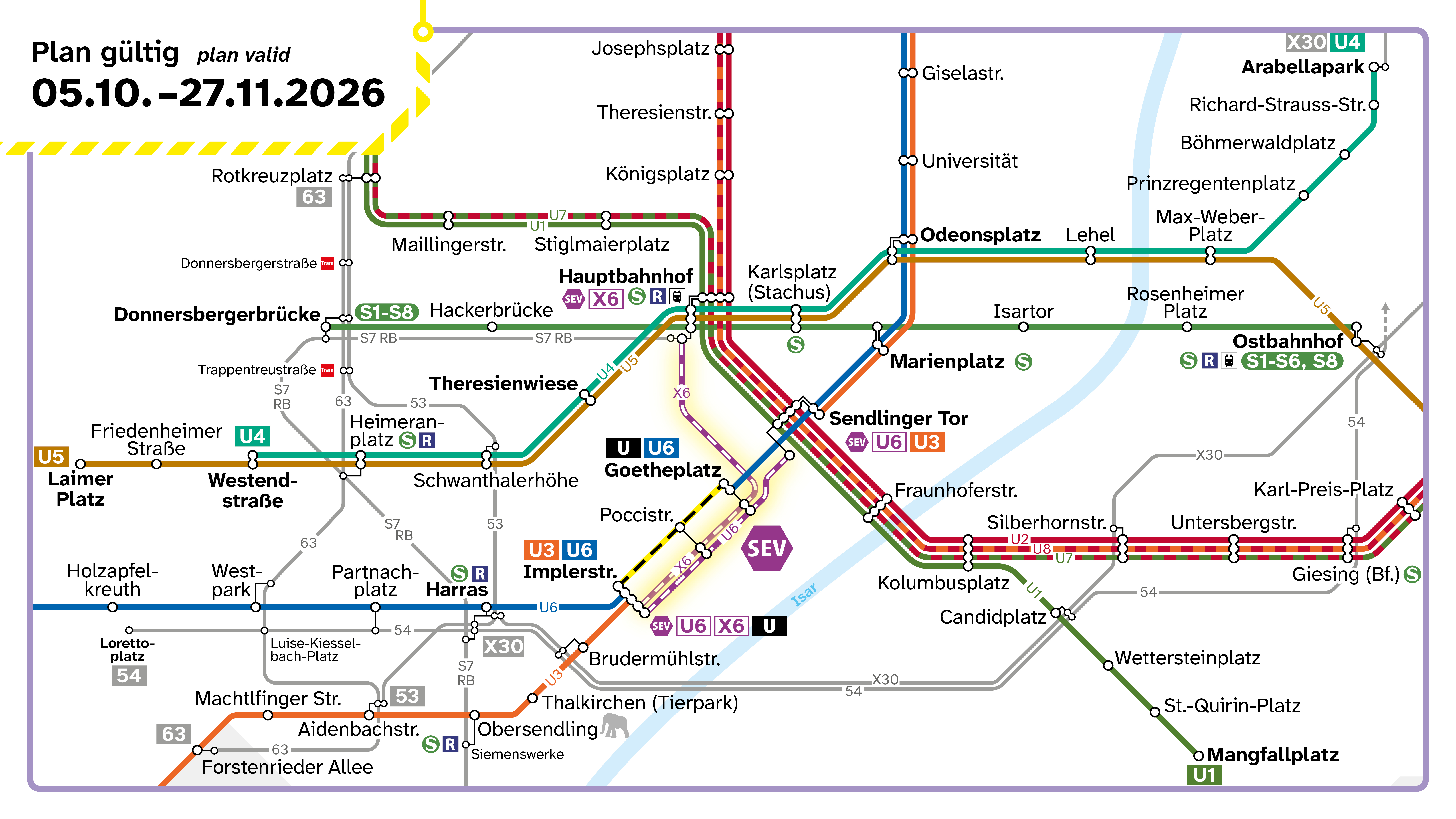 - Der Ersatzbus X6 bindet zusätzlich den Hauptbahnhof an und fährt im Abschnitt Implerstraße – Poccistraße – Goetheplatz – Hauptbahnhof Süd.