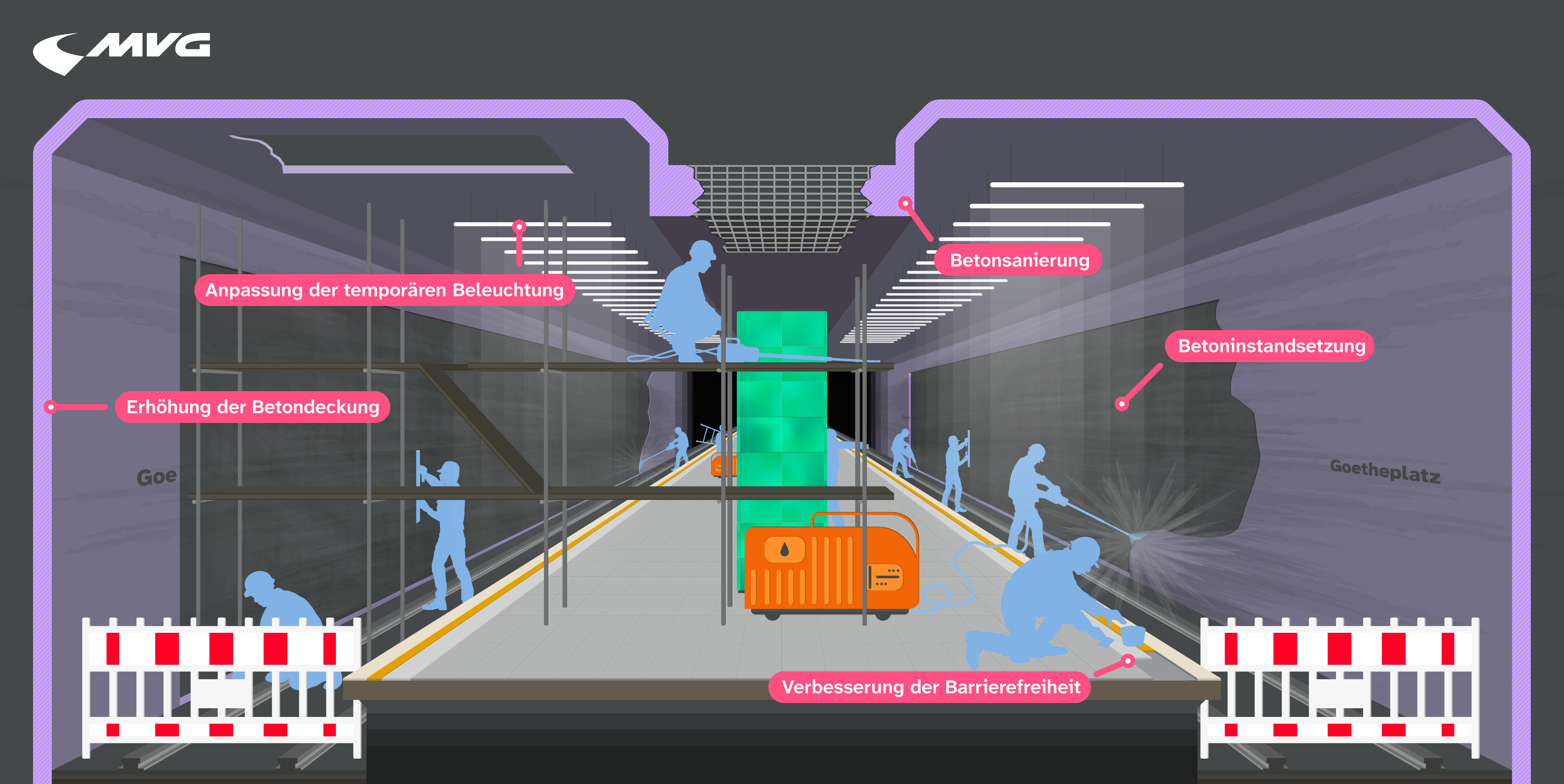 Die Stadtwerke München (SWM) und die Münchner Verkehrsgesellschaft (MVG) müssen die U-Bahnhöfe Poccistraße und Goetheplatz dringend sanieren, um die Sicherheit und Funktionalität der Bauwerke nachhaltig zu gewährleisten. Beide Stationen stammen aus der Anfangszeit der U-Bahn und sind in einem schlechten baulichen Zustand. An der Poccistraße ist eine statische Ertüchtigung notwendig, am U-Bahnhof Goetheplatz müssen Bauwerksschäden beseitigt werden.