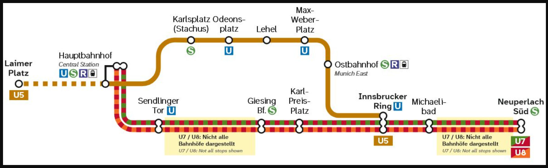 Die U5 fährt im Zeitraum von Donnerstag, 30. April, bis Sonntag, 21. Juni, am Wochenende von Freitag, ca. 22:30 Uhr, bis Sonntag Betriebsschluss sowie an Feiertagen nur zwischen Laimer Platz und Innsbrucker Ring. Zwischen Innsbrucker Ring und Neuperlach Süd können Fahrgäste die U8 beziehungsweise U7 nutzen und am Innsbrucker Ring oder am Hauptbahnhof umsteigen. Am Innsbrucker Ring ist teilweise ein Umstieg über das Zwischengeschoss notwendig.
